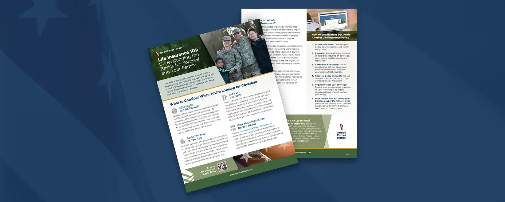 Start smart with Armed Forces Mutual’s Life Insurance 101: Early Life guide. Learn how to supplement SGLI, calculate ...