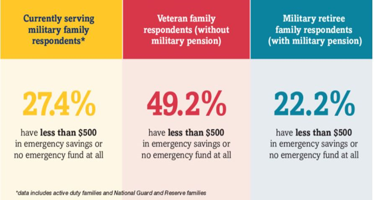 According to Military Family Advisory Network (MFAN), 27.4% of currently serving military family respondents have less than $500 in emergency savings or no emergency fund at all. Even more frightening, 49.2% of Veteran family respondents have less than $500 in emergency savings or no emergency fund, while nearly a quarter of families had no practical plan for seeking assistance in a financial emergency.