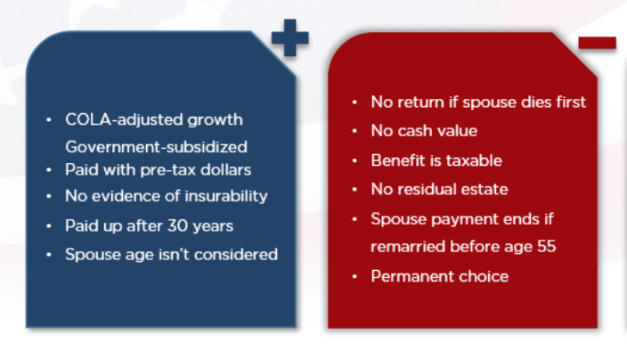 Lastly, there are a few other things you need to know about SBP. There is no evidence of insurability. Meaning the government could decide not to pay SBP and you would have no recourse. Secondly, if the surviving spouse remarries before the age of 55, benefits from SBP stop.
